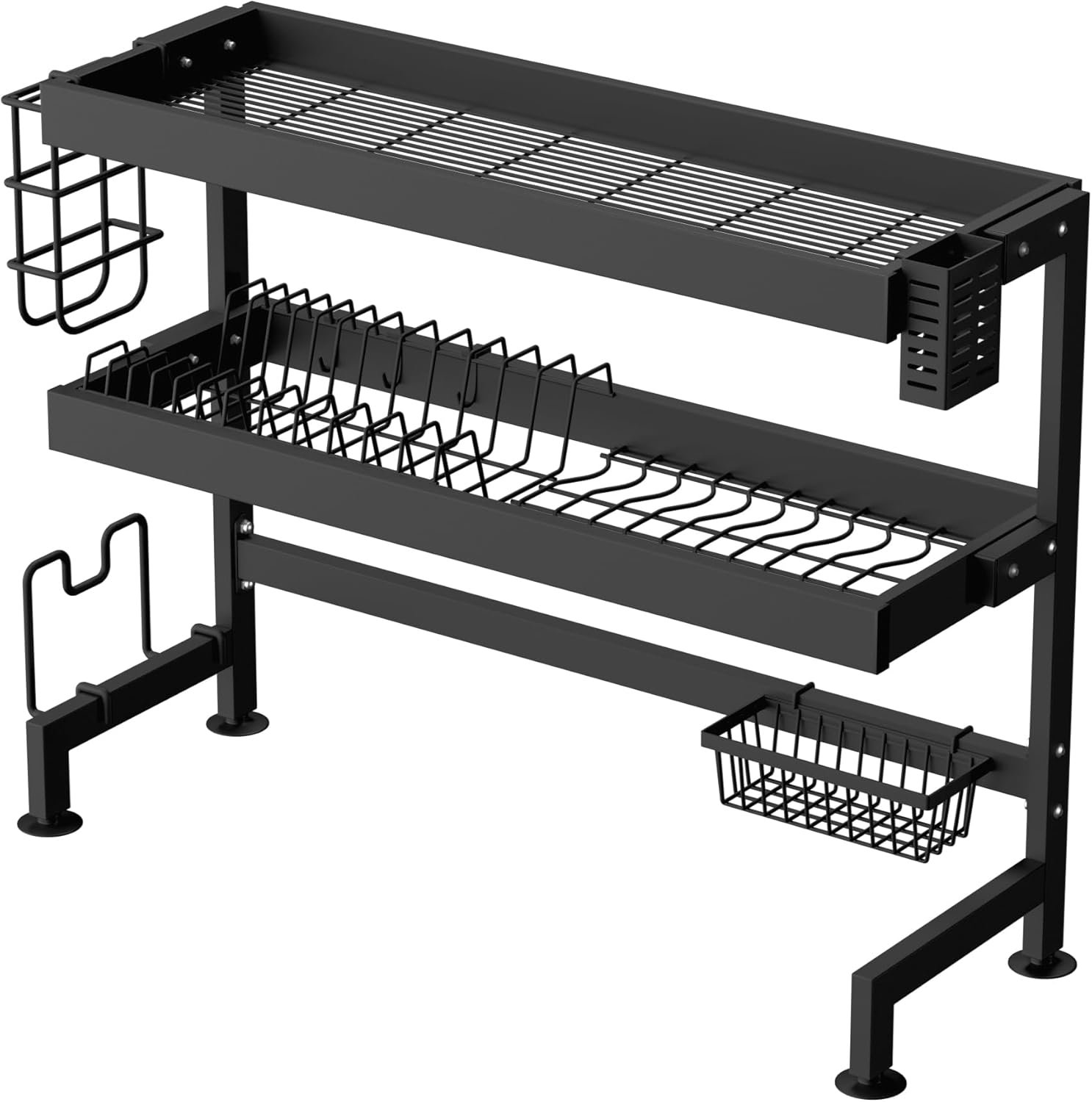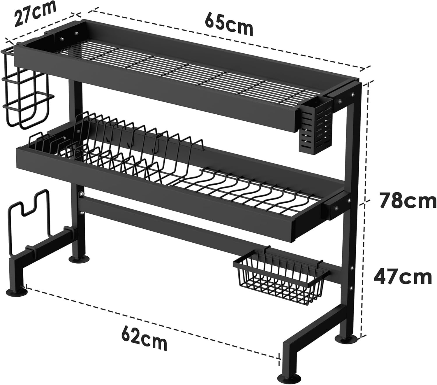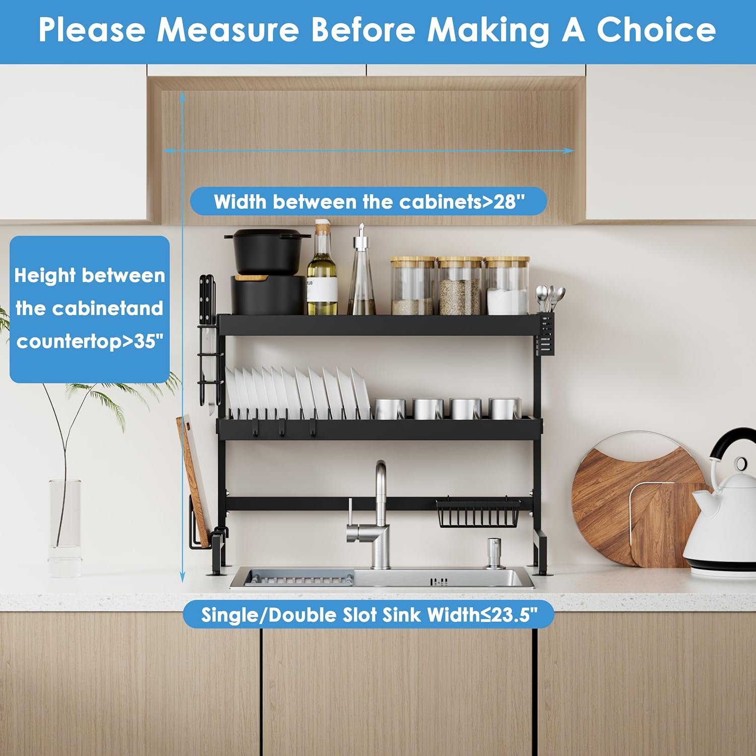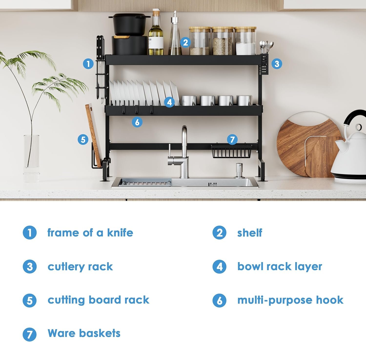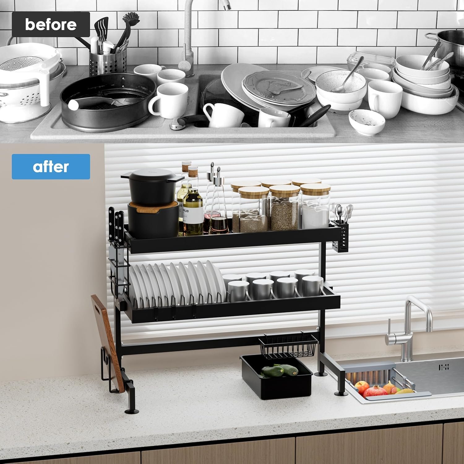 • سعة كبيرة: يمكن لمصفاة الأطباق متعددة الوظائف هذه استيعاب الأدوات والسكاكين والشوك والأطباق والأوعية والإسفنج وألواح التقطيع والفواكه والخضروات ولوازم المطبخ، كل ذلك في نظام تخزين واحد.