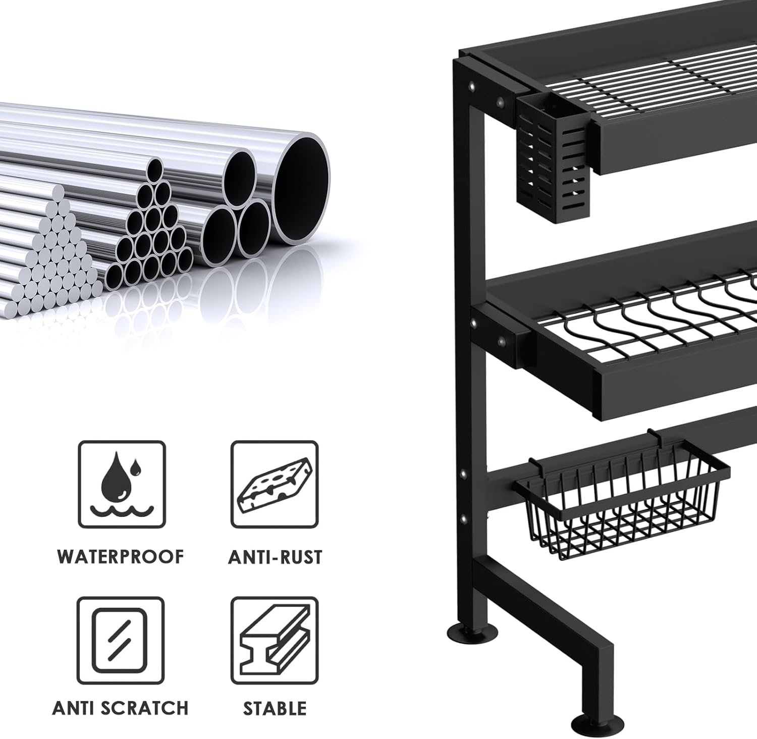 • تصميم فوق الحوض: تتيح لك مصفاة الأطباق العمودية المدمجة من STANEW غسل وتجفيف الأطباق مباشرةً فوق الحوض، مما يوفر مساحة على سطح العمل ويحافظ على مطبخك أكثر ترتيبًا. مثالية للمنازل والشقق الصغيرة والمساكن الجامعية، إلخ.