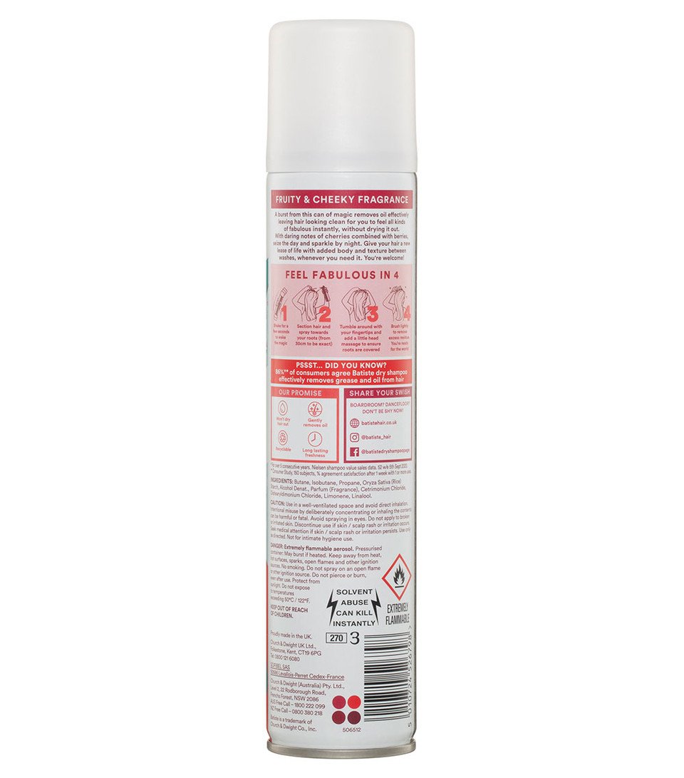 شامبو جاف من Batiste برائحة الكرز المنعشة والحيوية، مثالي لإضفاء لمسة فاكهية لذيذة على شعرك. يمنحك انتعاشًا فوريًا، يمتص الدهون الزائدة من فروة الرأس ويترك الشعر نظيفًا، خفيفًا ومفعمًا بالحيوية بين الغسلات.